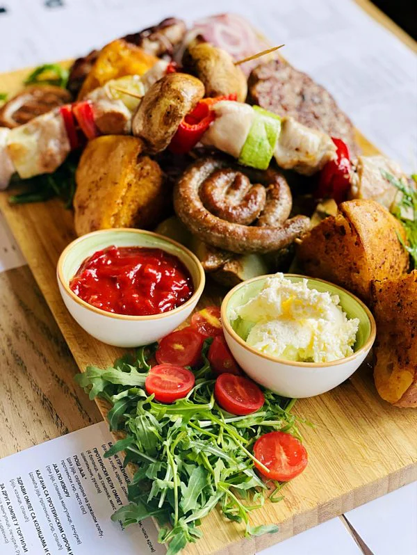 Pljeskavica, Mangulica-Wurst, Hähnchenfilet, Speck, gegrilltes Gemüse, Frischkäse, Ajvar, hausgemachte Kartoffeln