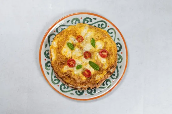 Eggs, cherry tomatoes, mozzarella, basil, ham, cheese, vegetables, Mediterranean spices, onion, mushrooms