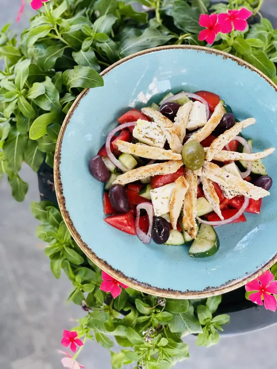A classic Greek salad enriched with juicy pieces of grilled chicken. The freshness of the vegetables and the salty taste of the cheese blend perfectly into a light, Mediterranean meal.