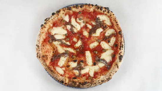 Peeled tomato, mozzarella, capers, anchovies, oregano