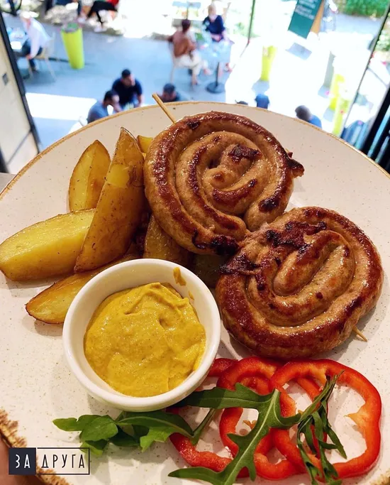Domaća kobasica od kvalitetnog mesa, poslužena uz pečeni krompir i pikantni senf. Jednostavno, zasitno i neodoljivo mirisno jelo.
