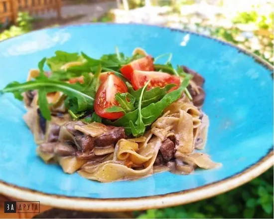 Bogata domaća pasta sa komadićima bifteka i pečurkama u kremastom sosu od pavlake. Prava kombinacija tradicije i luksuznog ukusa.