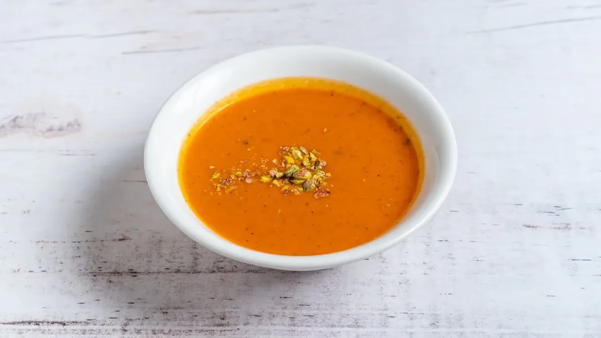 Neobična kombinacija kremaste paradajz čorbe i hrskavih pistaća za jedinstven kontrast ukusa.