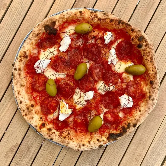 Pica snažnog mediteranskog karaktera – paradajz sa Vezuva i kremasti koziji sir čine osnovu, dok Iberico salama, zelene masline i blage niti peperoncina donose bogatstvo ukusa i aromu juga Španije i Italije