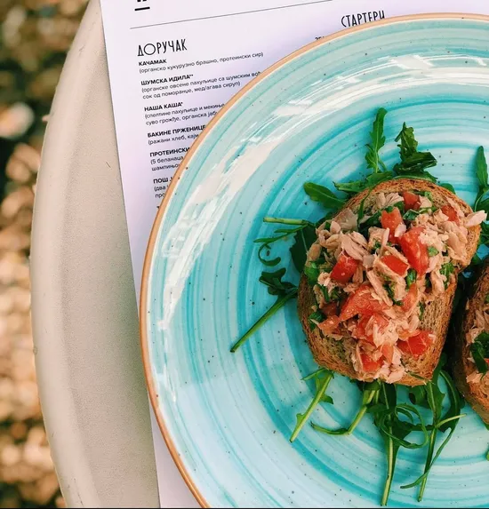 Ražani hleb, tunjevina, paradajz, rukola, pesto sos, beli luk