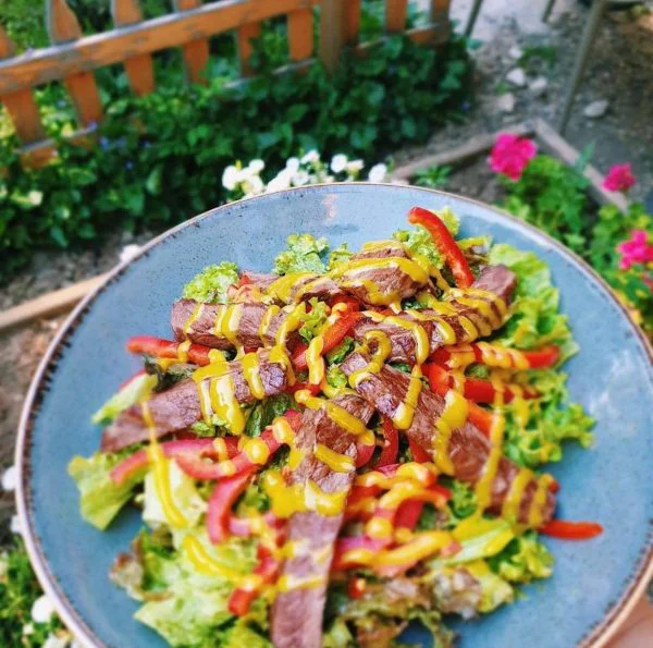 Sočni komadi bifteka na posteljici od svežih salata, začinjeni dižon senfom i maslinovim uljem, uz topli dodatak tortilje.