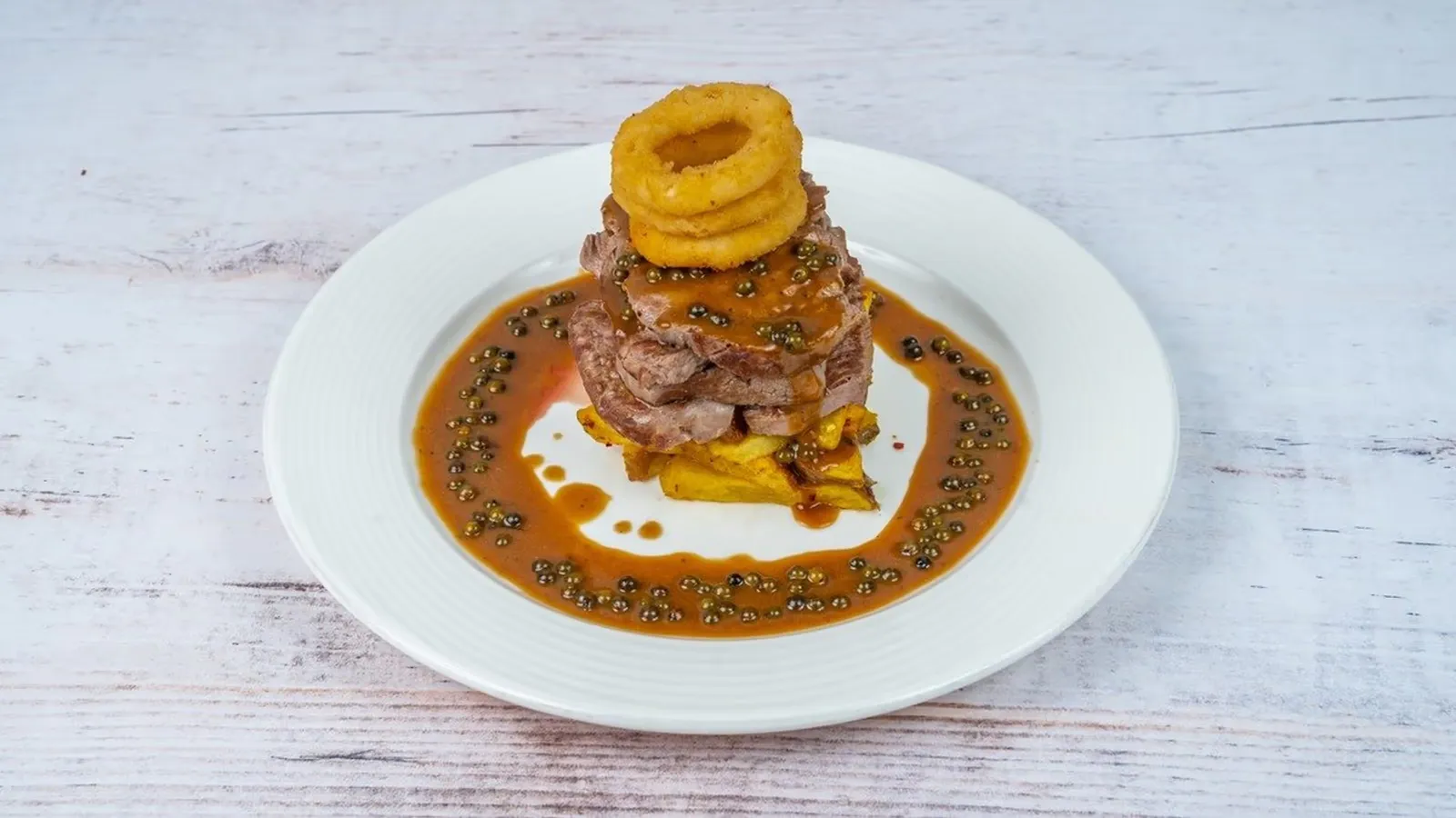 Стейк премиум-класса с насыщенным трюфельным соусом и хрустящим гарниром из картофеля и лука.