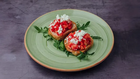 Хрустящие брускетты со свежими помидорами и ароматным базиликом, дополненные нежным козьим сыром. Лёгкая и освежающая закуска с идеальным балансом кисловатого и мягкого вкуса.