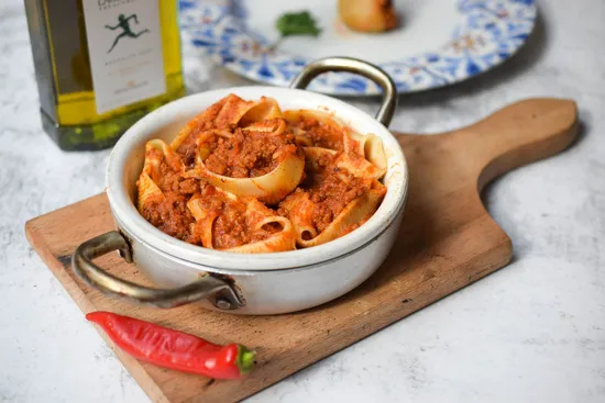 Специальная итальянская паста, говяжье рагу, острая калабрийская колбаса N'Duja, пармезан