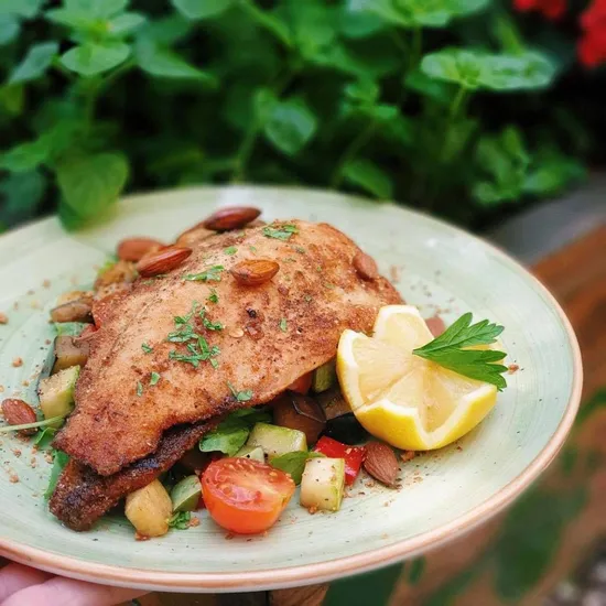 Лёгкое, белковое блюдо с копчёной форелью и слегка поджаренным миндалём. Жареные овощи придают свежесть и сбалансированно дополняют богатый вкус рыбы.
