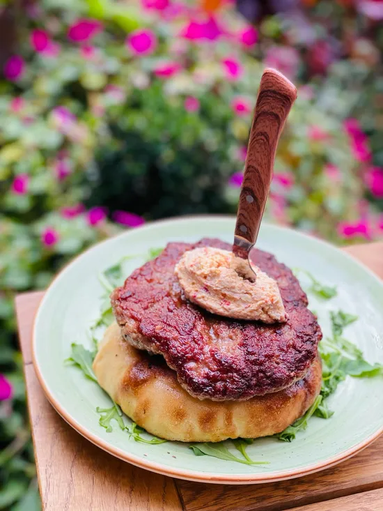 Сытная домашняя плескавица с лёгкой остринкой и кремовым урнебесом. Подаётся в тёплом сомуне и идеально подходит для настоящих любителей мяса.