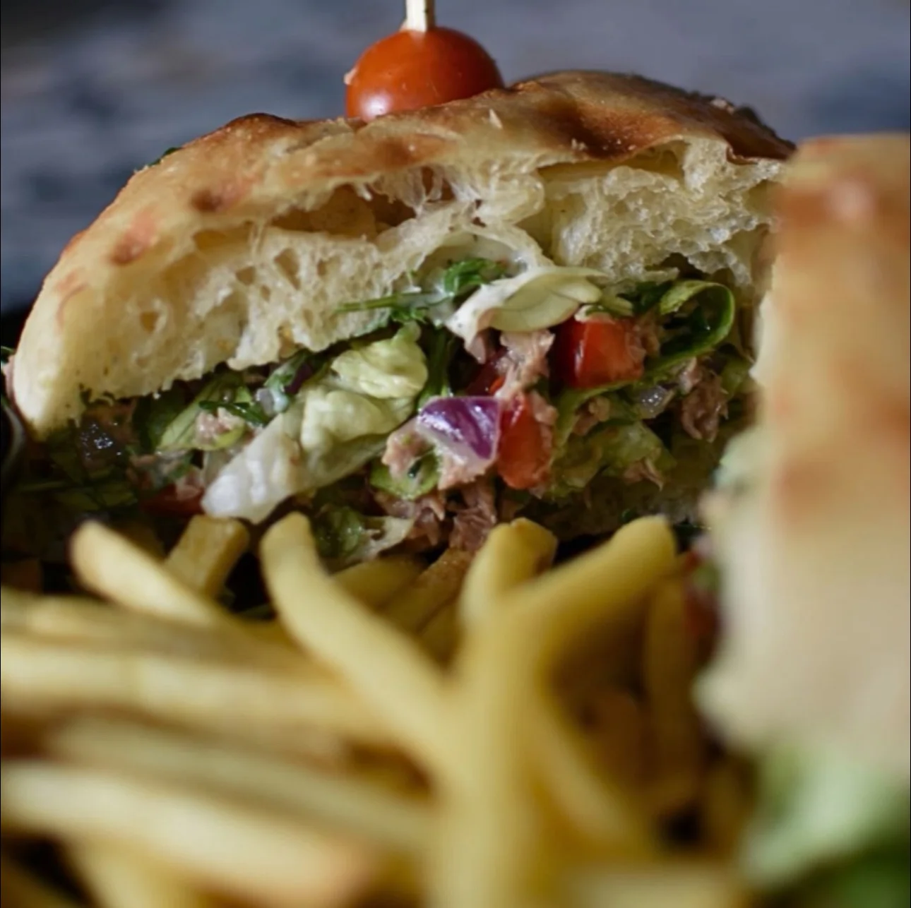 Тунец, паприка, красный лук, помидоры черри, корнишоны, руккола, постный тартар, лолло бьянко, картофель фри, кетчуп, лепешка
