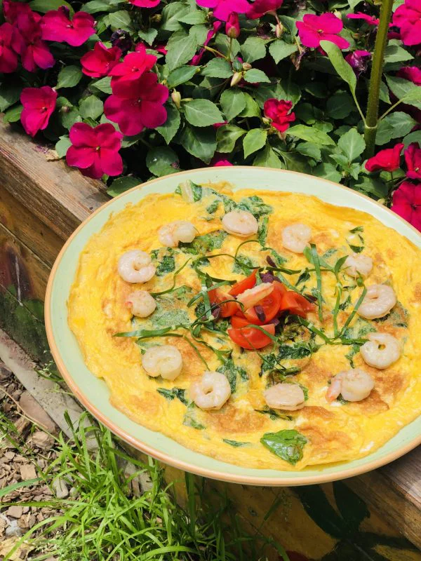 Легкий протеиновый завтрак из свежих домашних яиц и сочных креветок, обогащенный шпинатом, обеспечивающим идеальный баланс питательных веществ.
